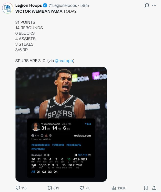 DPOY第一+MVP第二!文班场均33+13+6帽 马刺三连胜复兴之光已现